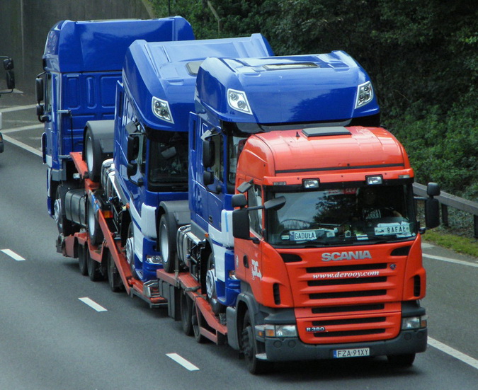 De Rooy are seen on ther UK motorway network all of the time delivering variuos types of vehicle from tractors to lorries of all shapes and sizes.Pictured here is one of their drawbars delivering what looks like 3 new tractor units for Cranleigh Freight. Photo courtesy of and copyrighted to Jim Lennox.