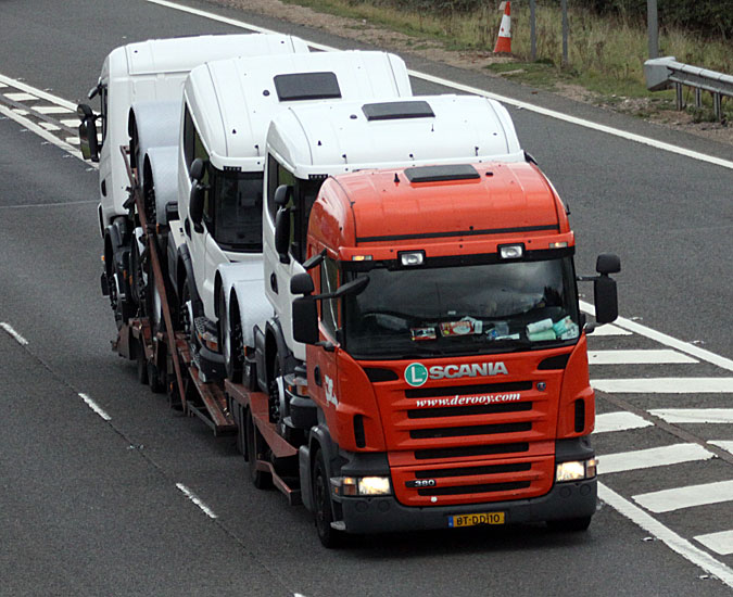 The fleet of De Rooy can be seen all over the UK delivering various kinds of commercial vehicles. The Scania drawbar is seen here on the M40 recently transporting G440 6x2 tractor units, possibly on the way to Carlisle ? The photo is courtesy of and copyrighted to John Martin.