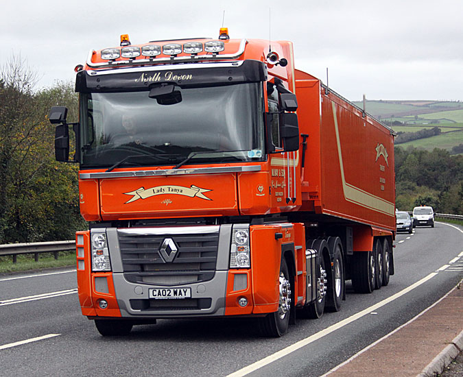 M Way have recently taken delivery of a brand new Renault Magnum which has been named Lady Tanya. The vehicle is pictured here on the A361 at Pincombe Corner near South Molton. The photo is courtesy of and copyrighted to John Martin.