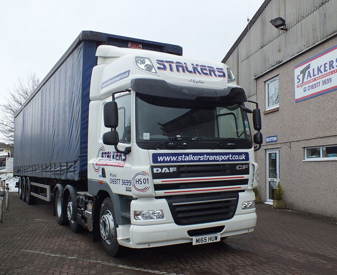 Stalkers Transport have just added a new DAF to their fleet in tribute to late owner Hughie Stalker who passed away recently. The vehicle carries reg MI 55 HUW as in miss you (Huw), and also has fleet number HS 01.